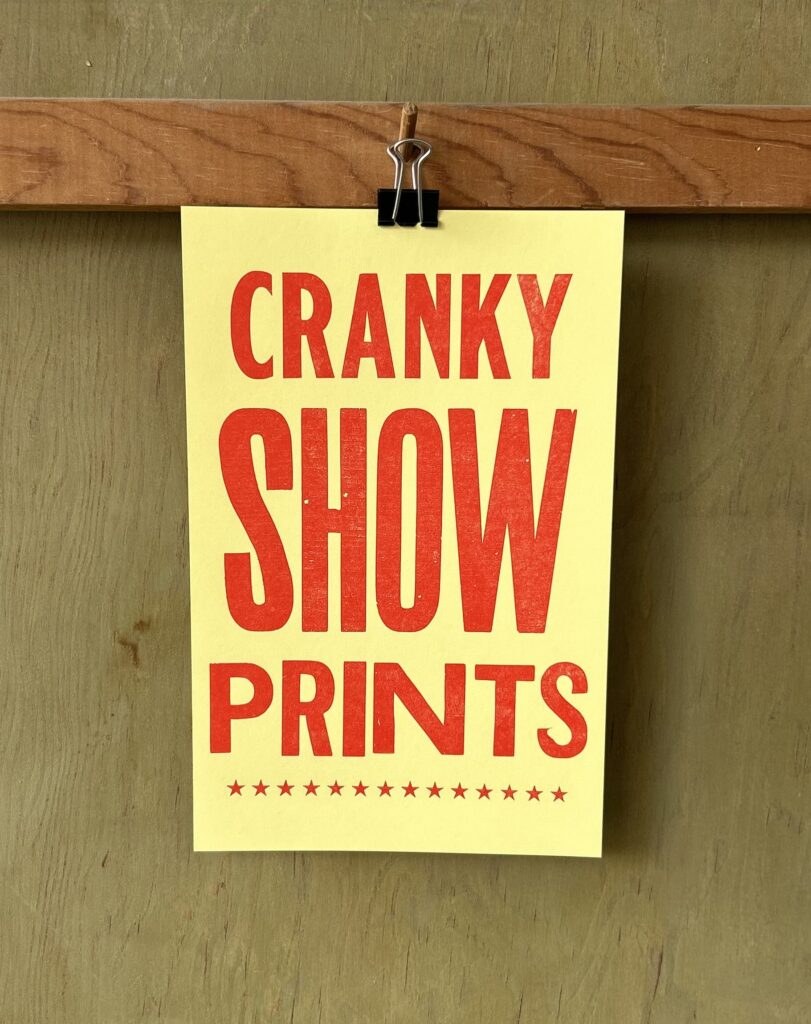 Cranky Show Prints are built out of lead and wood type and then letterpress printed. Why hand build something when you can just clickety-click and create on the keyboard? Because it is cool and it is an analogue experience. Our handcrafted prints offer a tangible and timeless appeal. And yes, there is a difference that you can see and feel. It is something that will set your message apart from the usual ho hum digital noise. Available in small affordable quantities, you can use show prints for branding, selling, announcing, inviting, packaging and thanking. Ready to get cranking? Order your Show Prints today by emailing CrankyPress@gmail.com or really go old school by calling 1-800-433-1288.